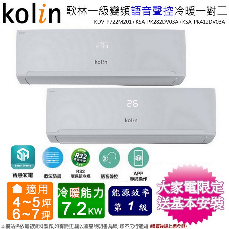 Kolin歌林4-5坪+6-7坪一級變頻冷暖語音聲控一對二分離式冷氣KDV-P722M201+KSA-PK282DV03A+KSA-PK412DV03A~含基本安裝+舊機回收