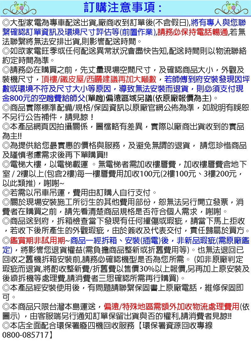 ◎請務必在購買之前,先丈量現場空間尺寸,及確認商品大小,外觀及裝機尺寸,頂樓/鐵皮屋/西曬建議再加大噸數,若師傅到府安裝發現因坪數或環境不符及尺寸大小等原因,導致無法安裝而退貨,則必須支付現金800元的空趟費給師父(單趟)偏遠區域另議(依原廠報價為主)。