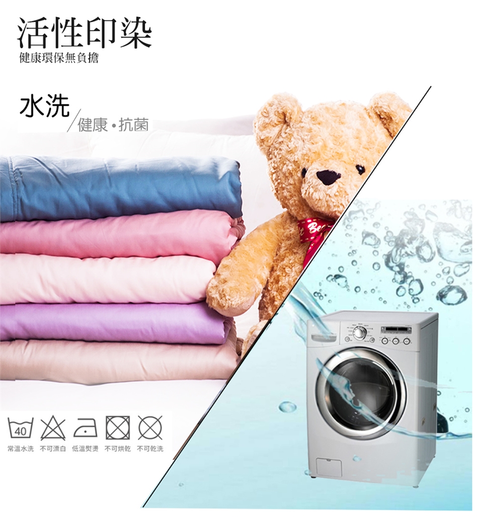 可水洗,可乾洗,不可漂白(建議先將洗衣精/洗衣粉倒入水中,待溶解後再放入寢具洗滌;寢具亦可放入大型洗衣袋再清洗)