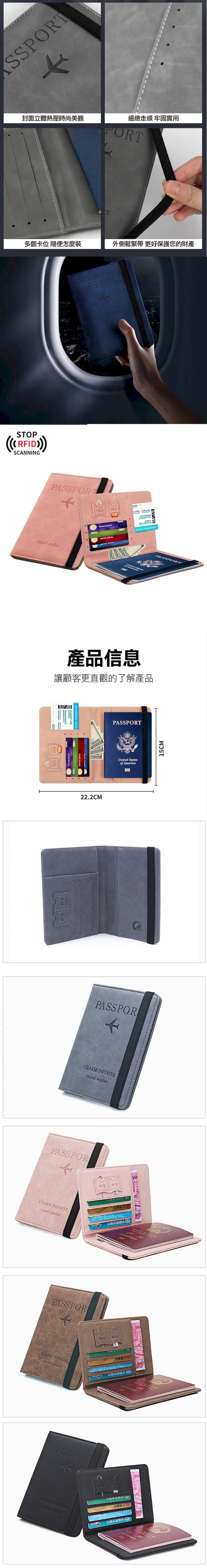 簡約質感皮革,多層卡位設計,可收納機票、護照、信用卡、紙鈔,輕薄不厚重,重要證件隨身攜帶,有效干擾RFID信號,預防盜刷,鬆緊帶設計,防止內容物遺失掉落,舒適皮革手感,細緻走線,牢固耐用