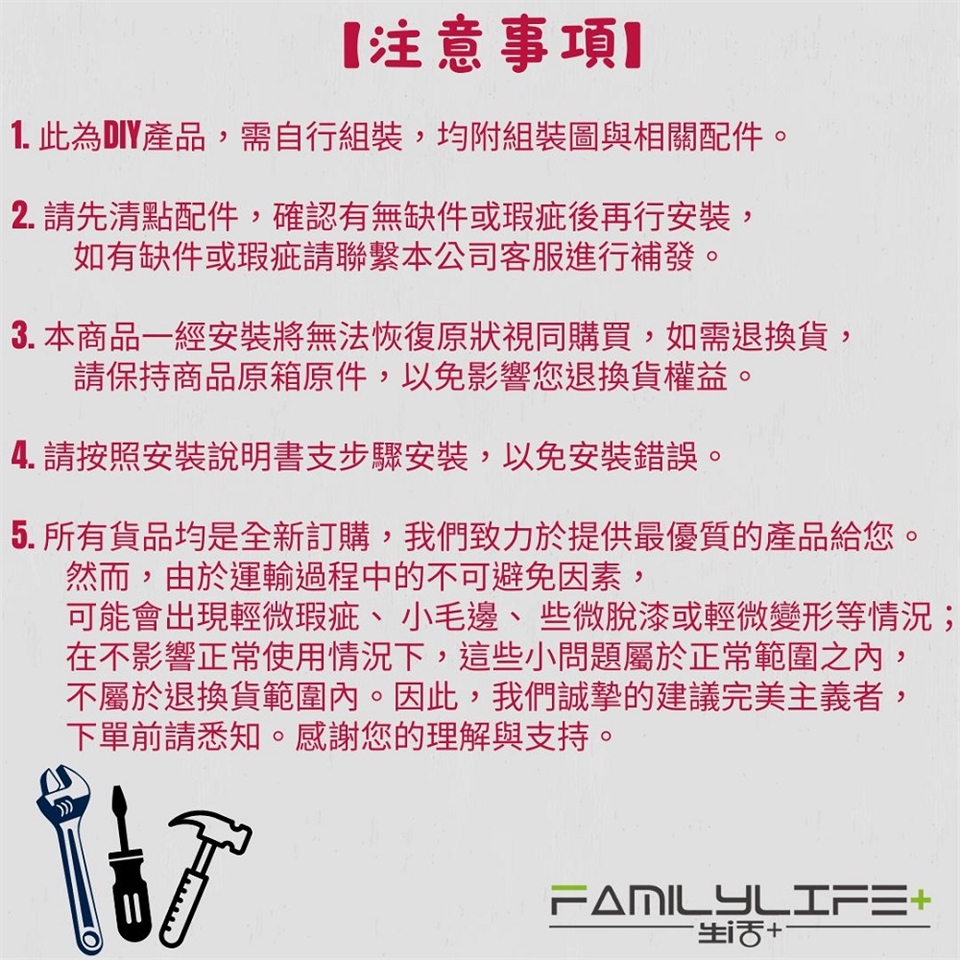 2.請先清點配件,確認有無缺件或瑕疵後再行安裝,如有缺件或瑕疵請聯繫本公司客服進行補發。