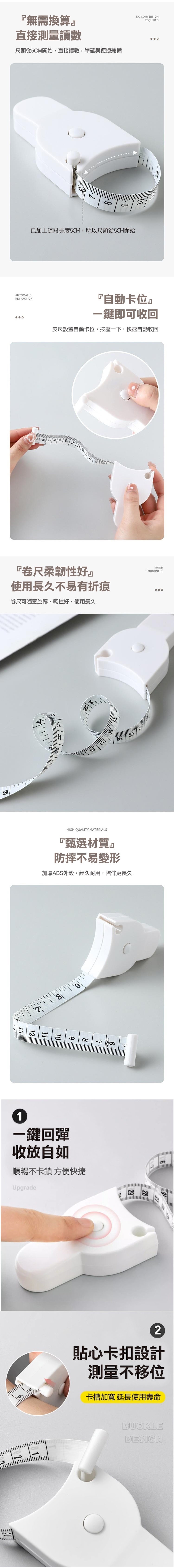 卡扣固定,凹槽設計,簡單操作一鍵回彈,單手即能操作,雙面刻度,英吋釐米自由切換,刻度清晰,精準測量,柔韌性好,長久使用不易有折痕,測量廣泛,萬能使用,輕巧便攜,隨處可量