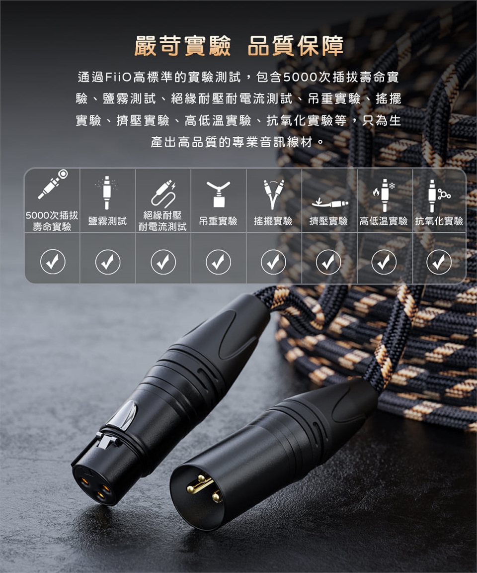 嚴苛實驗 品質保障 | 通過FiiO高標準的實驗測試,包含5000次插拔壽命實驗、鹽霧測試、絕緣耐壓耐電流測試、吊重實驗、搖擺實驗、擠壓實驗、高低溫實驗、抗氧化實驗等,只為生產出高品質的專業音訊線材。