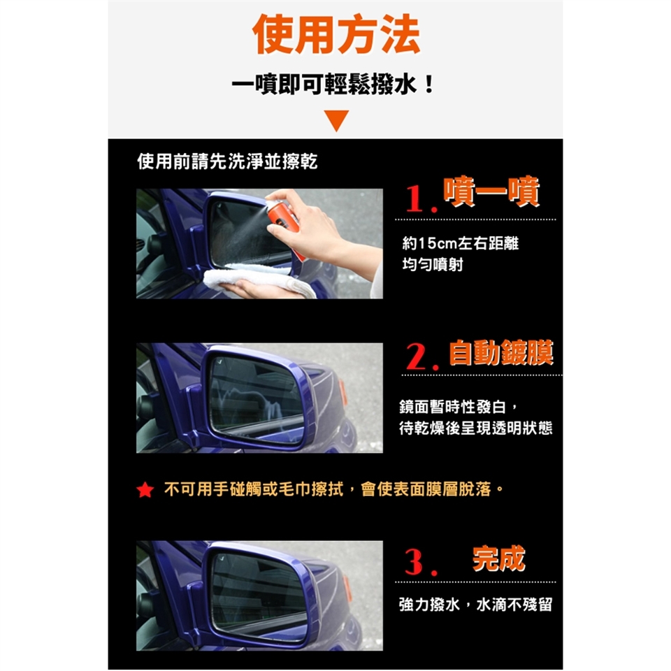 不可噴到車漆上,誤噴到後視鏡以外的部位時,要立即用濕毛巾擦拭乾淨。