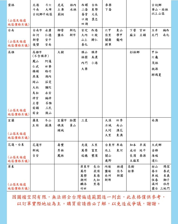 隔日配達僅限平地及市區,山區劃分則依物流約配說明為主。