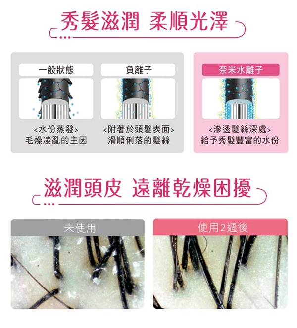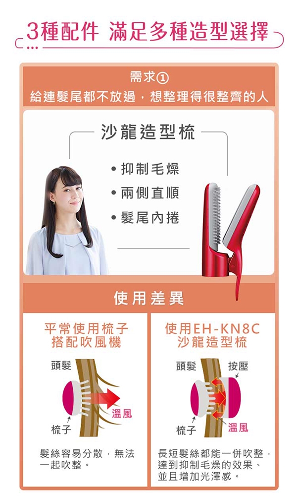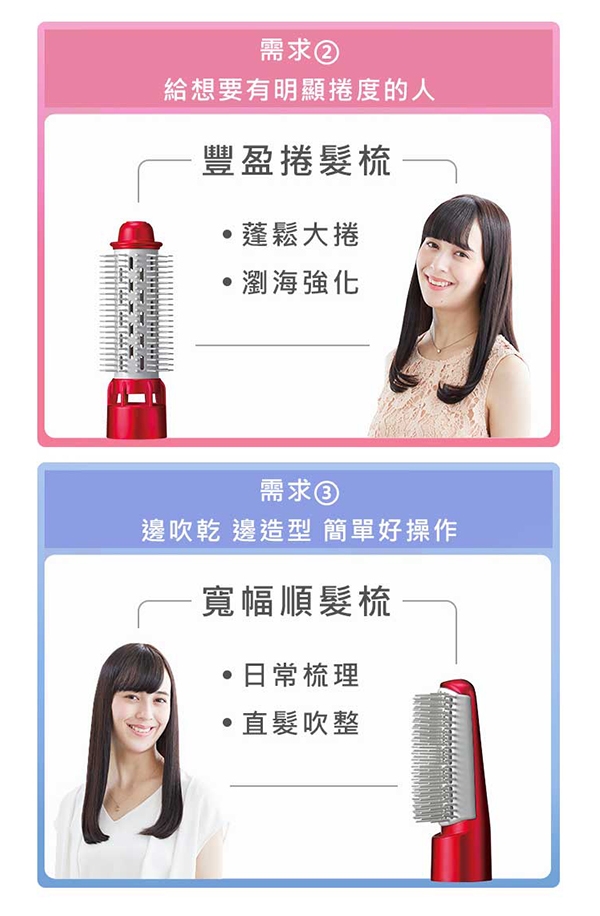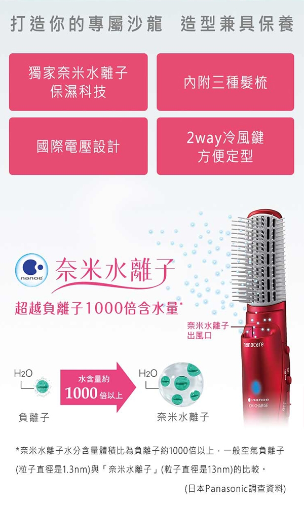 ◆奈米水離子 保濕造型兼具,超越負離子1000倍的保濕力,能浸透髮絲,使髮質健康強韌有光澤◆造型3件組 多種造型選擇,寛幅順髮梳(日常梳理/直髮吹整)、豐盈捲髮梳(蓬鬆大捲/瀏海強化)、沙龍造型梳(抑制毛躁/兩側直順)