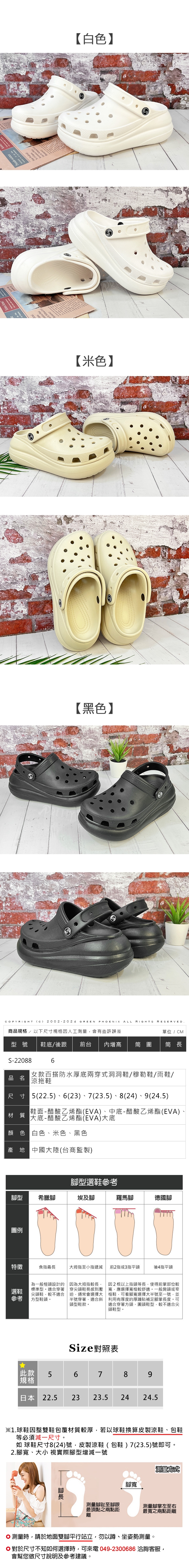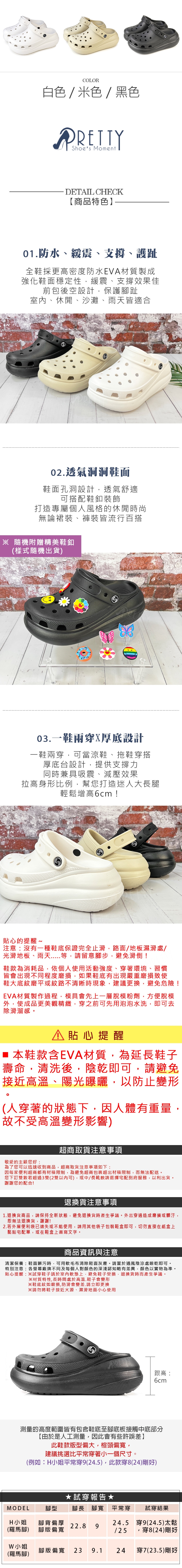 P.S. 貼心提醒,本鞋款含EVA材質,為延長鞋子壽命,清洗後,陰乾即可,請避免接近高溫、陽光曝曬,以防止變形。