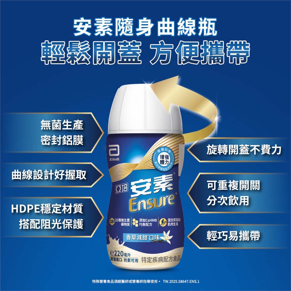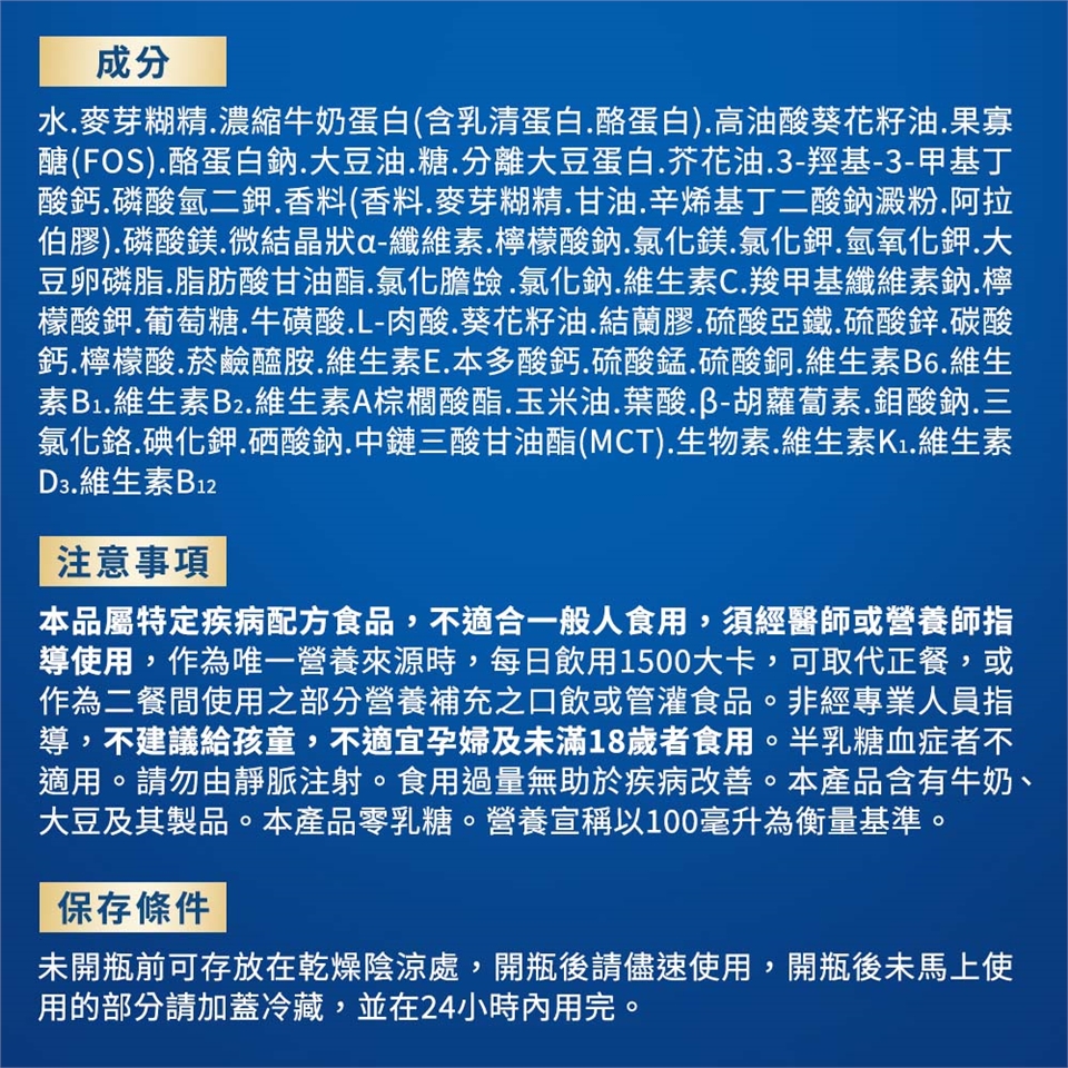 本品屬特定疾病配方食品,不適合一般人食用,須經醫師或營養師指導使用,作為唯一營養來源時,每日飲用1500大卡,可取代正餐,或作為二餐間使用之部分營養補充之口飲或管灌食品。非經專業人員指導,不建議給孩童,不適宜孕婦及未滿18歲者食用。半乳糖血症者不適用。請勿由靜脈注射。食用過量無助於疾病改善。本產品含有牛奶、大豆及其製品。本產品零乳糖。營養宣稱以100毫升為衡量基準。