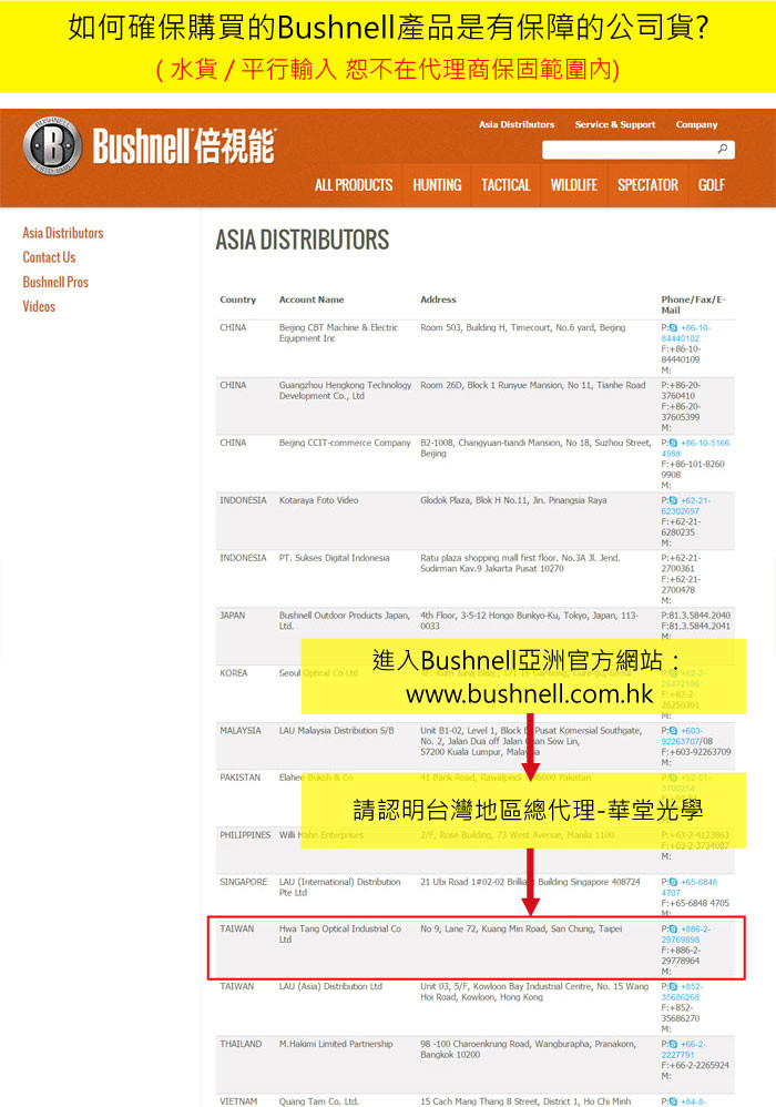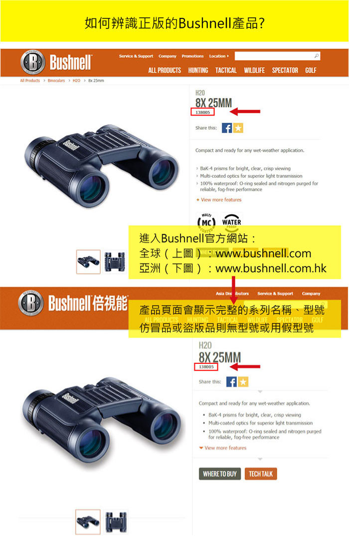由於坊間門市店面、網路購物皆出現品質低劣的仿冒品/盜版品,故提供下列方式以供消費者辨識美國Bushnell正版產品: