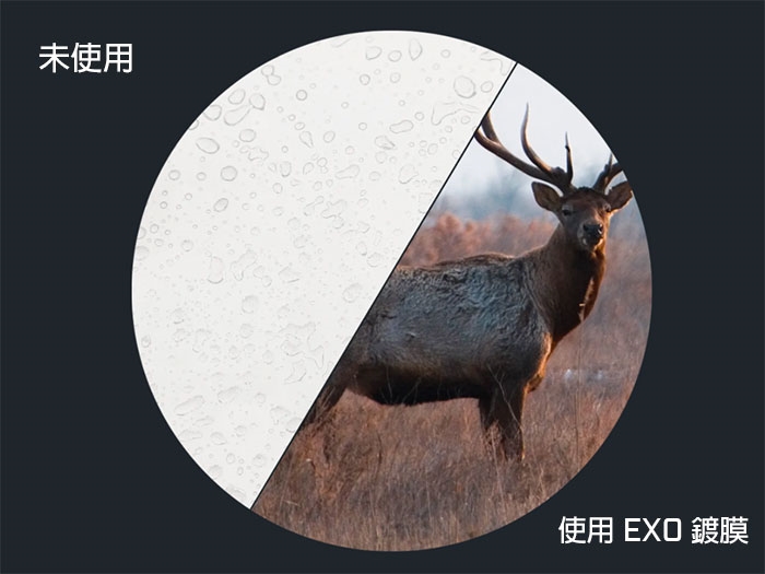 以往光學產品遇到大量水氣(如下雨、山間起霧),會造成鏡面嚴重霧化,令人玩興大減。Bushnell 在廣受好評的 Rain Guard HD 高解析防潑水鍍膜的基礎上再次開發的全新鍍膜技術。EXO Barrier 提供更優異的鏡片保護,透過分子鍵合到鏡片玻璃中的微小細孔,形成超級光滑的表面,可以排開雨水、油、霧氣、水氣、雪、灰塵、細屑等;原本扁平的水滴形成小而高的水滴,讓光線得以穿過,減少光線散射,在雨天仍能獲得清晰不失真的成像,確保不會錯失你的關鍵時刻。