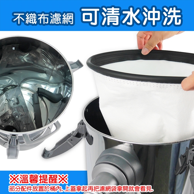 部分配件放置於桶內濾網袋下方,上蓋拿起再把濾網袋拿開就會看見