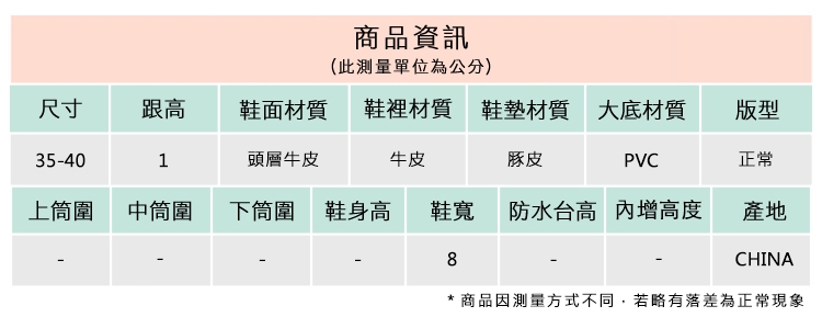 2.鞋類商品依功能及用途之不同,鞋底各有其止滑係數之個別不同,使用鞋類商品請用於正常平坦之路面,非雨鞋或雨靴類商品,請避免穿著於下雨濕滑路面上行走。