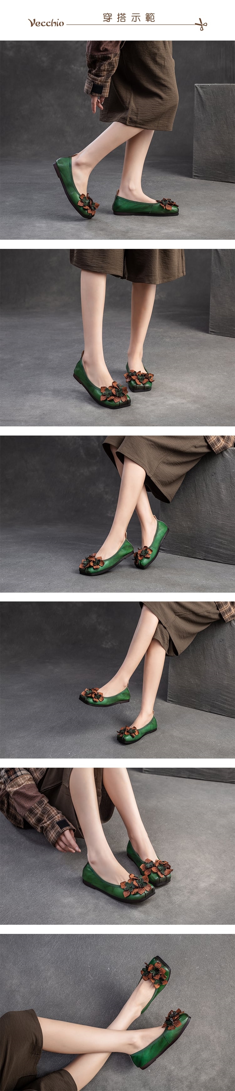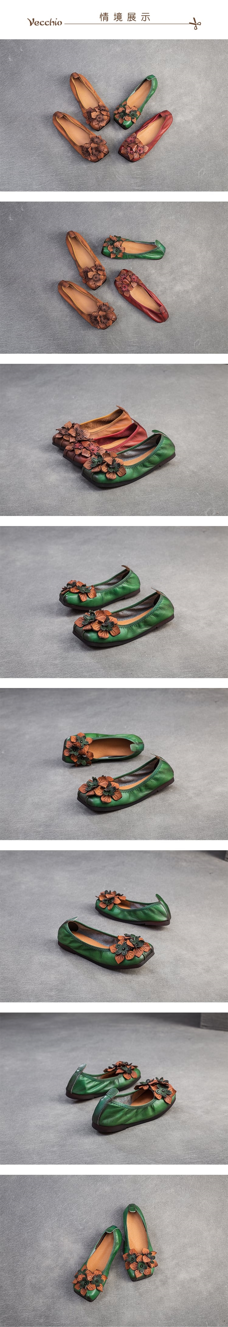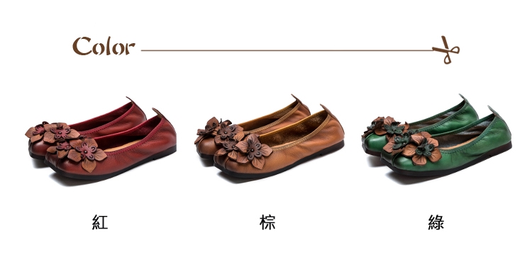 【VECCHIO】全真皮花朵方頭便鞋/全真皮頭層牛皮手工立體花朵寬楦方頭舒適便鞋 女鞋 綠