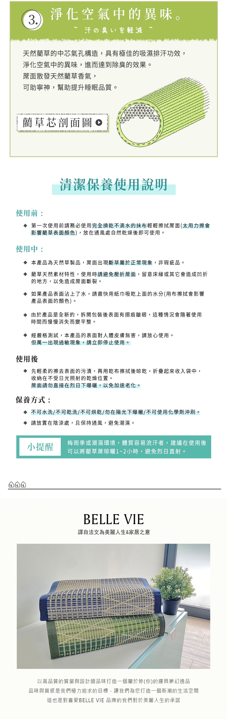 藺草中芯氣孔構造能吸附濕氣,有效淨化空氣中的異味,散發淡淡藺草香氣,可助寧神,幫助提升睡眠品質。