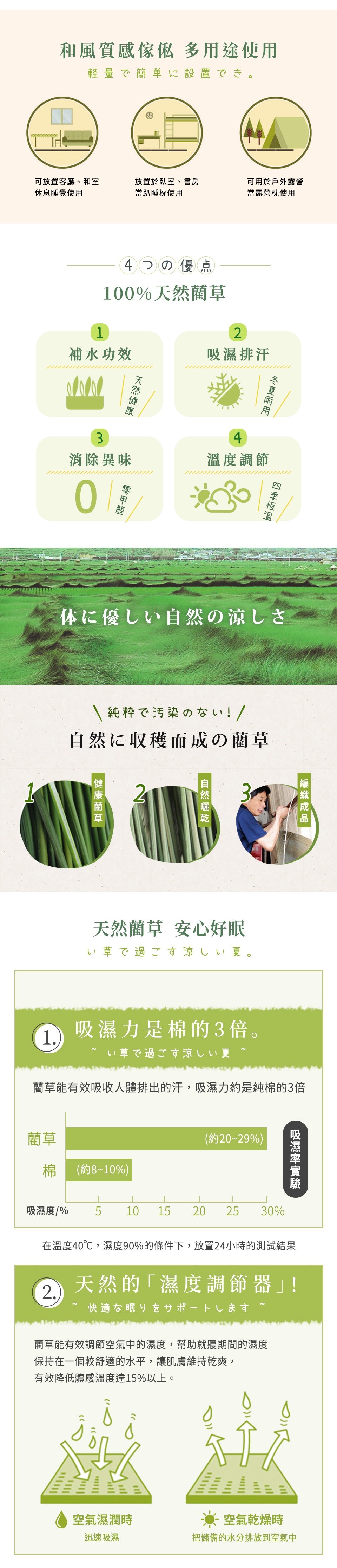 採用天然藺草精緻編制,透氣排汗、調節溫度、涼而不冰冷、觸感極佳,搭配淡淡藺草香氣,柔和舒適,實在超清爽~