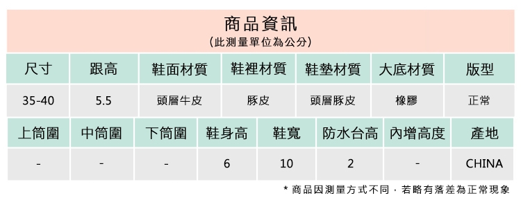 2.鞋類商品依功能及用途之不同,鞋底各有其止滑係數之個別不同,使用鞋類商品請用於正常平坦之路面,非雨鞋或雨靴類商品,請避免穿著於下雨濕滑路面上行走。