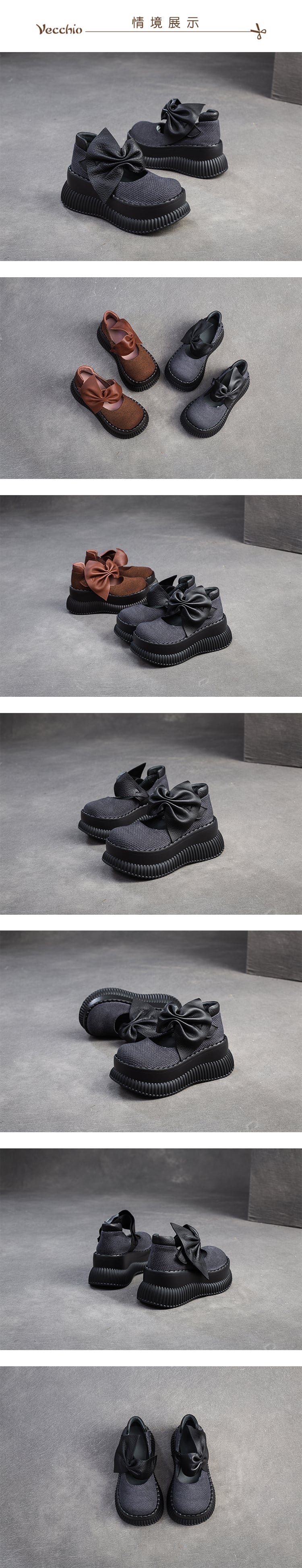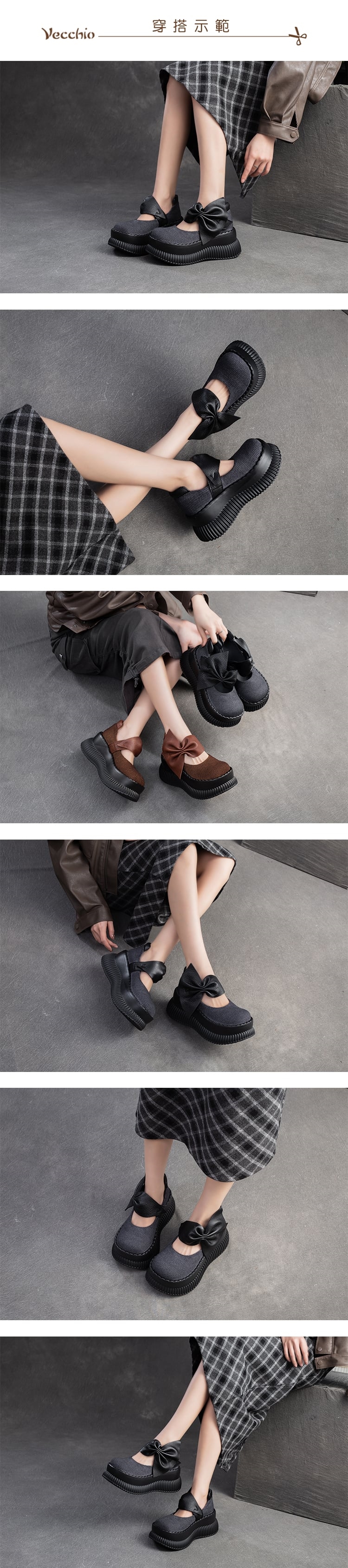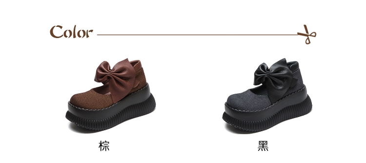 【VECCHIO】真皮透氣棉麻娃娃鞋/真皮頭層牛皮透氣棉麻布拼接蝴蝶結造型厚底娃娃鞋 女鞋 黑