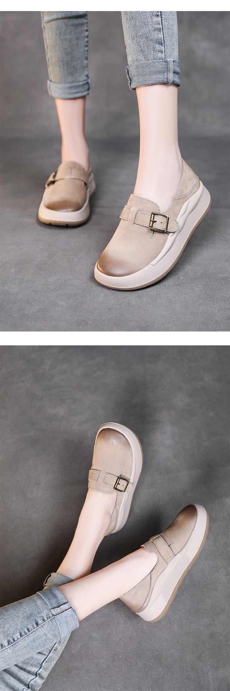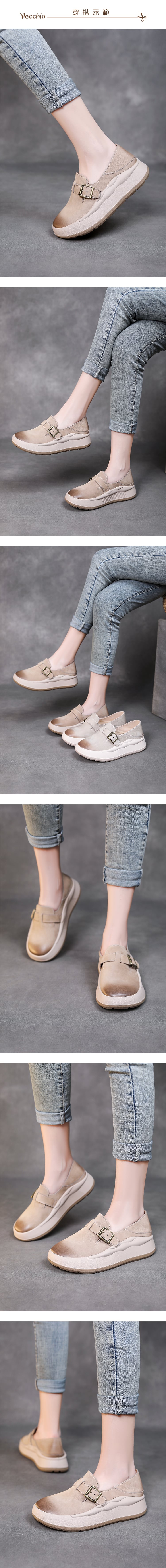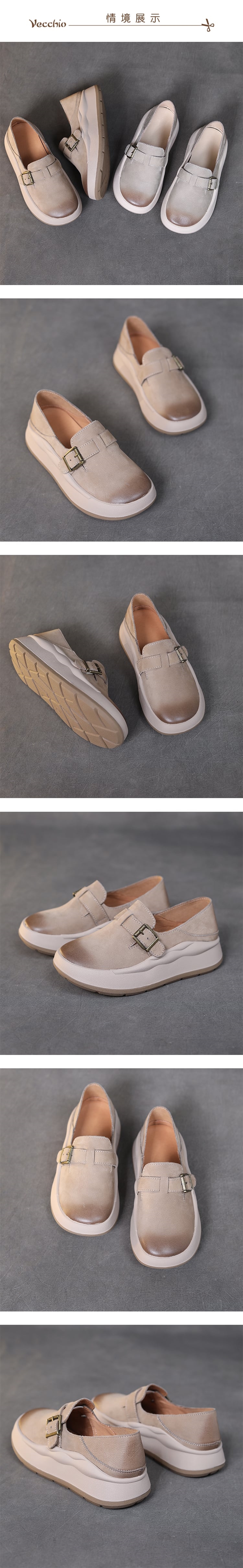 【VECCHIO】全真皮休閒鞋/全真皮頭層牛皮舒適寬楦大圓頭厚底休閒鞋 女鞋 卡其