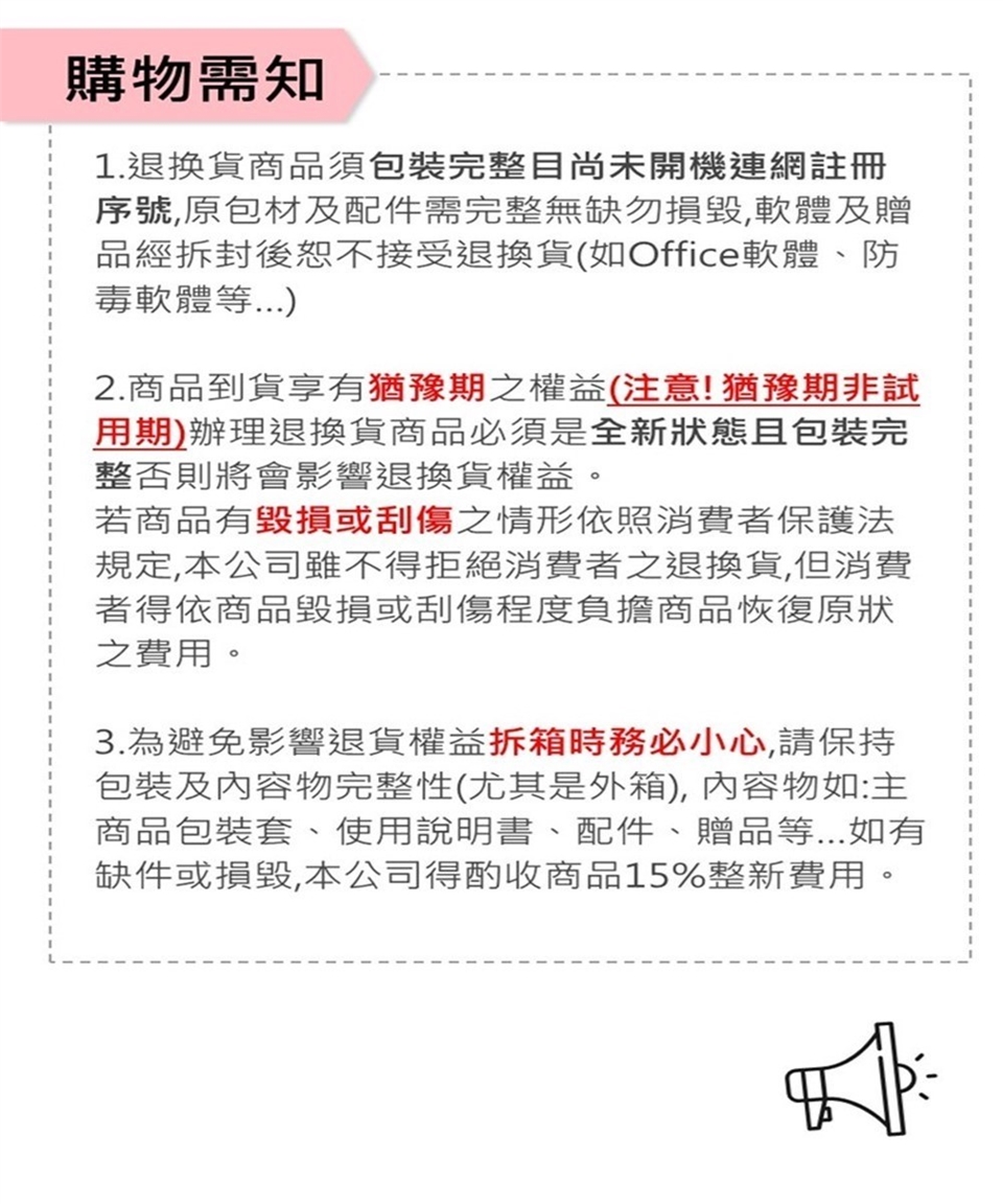 注意事項/退/換貨商品須保持商品本身外觀、包裝及配件完整;軟體及贈品經拆封後不接受退貨。/鑑賞期並非試用期,商品若有人為使用的刮傷或包裝損毀,皆須負擔整新費用(依程度收取回復原狀之費用)消費者於商品到貨十日猶豫期(非適用期)期間內因檢查之必要而置商品有毀損或刮傷之情形,依照消費者保護法規定,本公司雖不得拒絕消費者之退換貨,但消費者得依商品毀損或刮傷程度負擔商品恢復原狀之費用。 商品規格可能會依照國家地區而有所變動,皆以原廠公佈為準。 商品顏色可能會因拍照光線誤差或螢幕設定而與實際產品有所差異。我們會盡力提共正確與完整的資料於網頁上,並保留更動、修正頁面資訊的權利,恕不另行通知。贈品數量有限。若已送完,我們將保留贈送其他等值贈品之權利。
