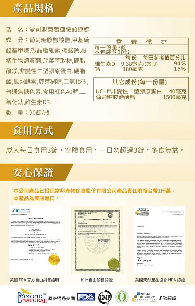 ◆產品成份:葡萄糖胺鹽酸鹽、甲基硫醯基甲烷、微晶纖維素、碳酸鈣、