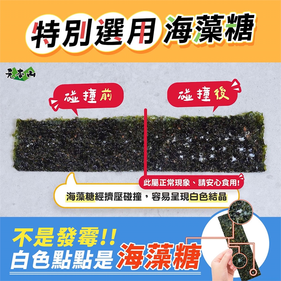 海苔上若有白色結晶或粉狀物,係為海苔表面之脆皮糖衣經摩擦或擠壓造成,敬請安心食用。