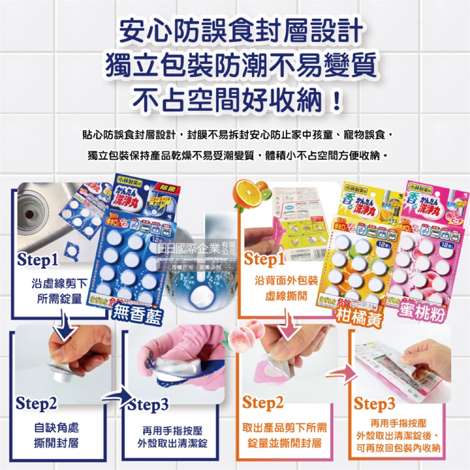 (2)柑橘黃、蜜桃粉:沿背面外包裝虛線撕開,取出產品剪下所需錠量並撕開封層,再用手指按壓外殼取出清潔錠後,可再放回包裝內收納。