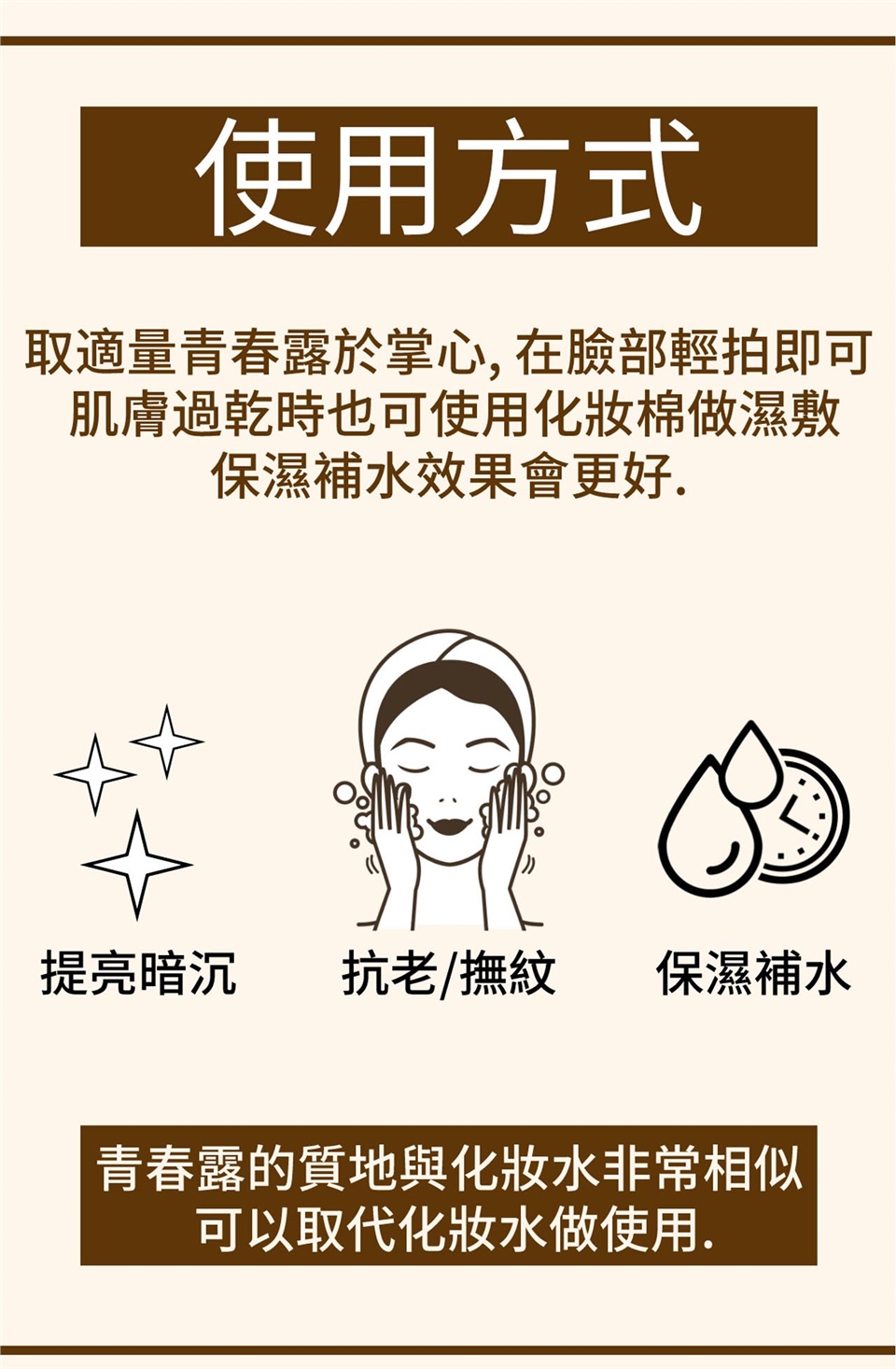 清潔臉部後,以化妝棉適量浸濕輕拍全臉至吸收,或潤濕雙手以指腹均勻輕拍全臉後,再以掌心輕輕按壓至吸收即可