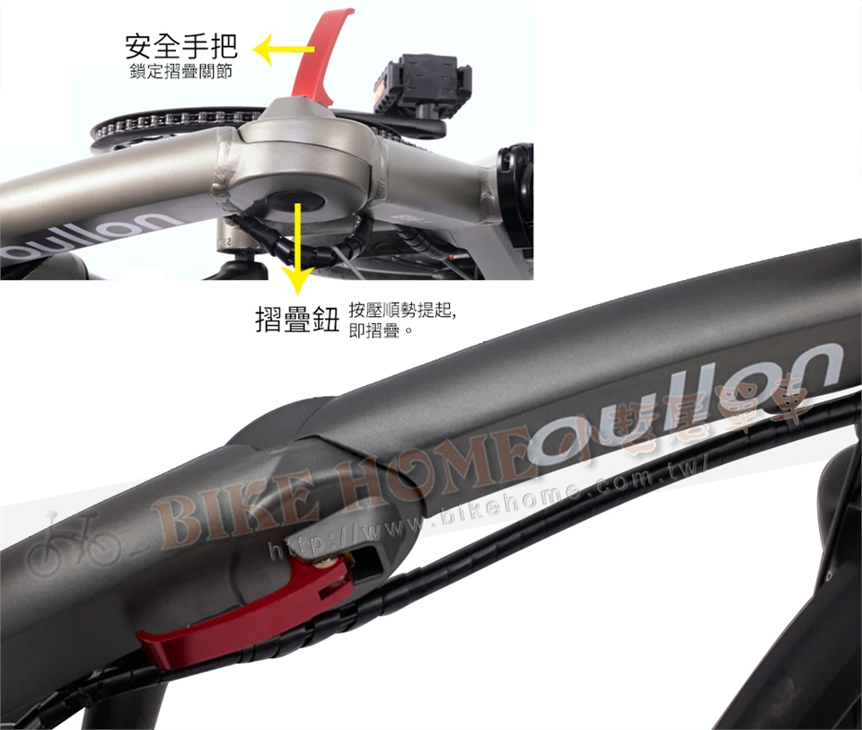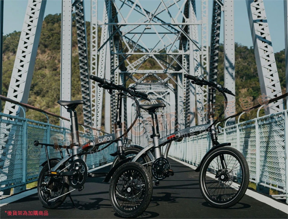 開創性的設計 - 偏斜旋轉關節 - 擁有封閉式機構及精準的旋轉角度。摺疊如同彎曲,看不到車架的橫截面,展開與收起可利用輪胎達成更省力的操作。全新一體式的前輪單臂,利用特殊鍛造製程,從頭管延伸至前輪軸的俐落曲線,呼應oullon的設計理念,讓整體輪廓更為優雅。