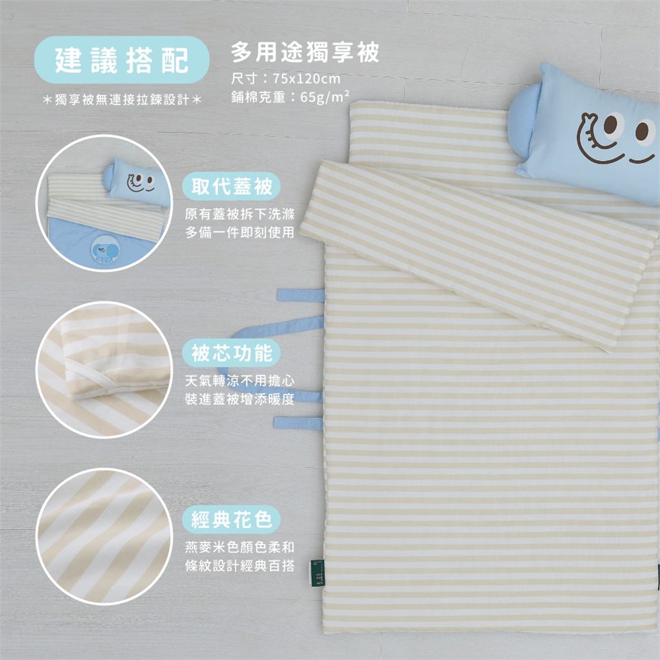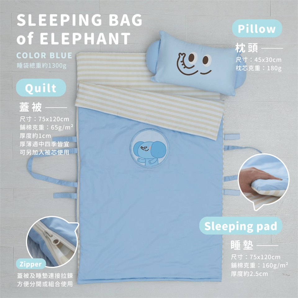睡袋選用純棉及二重紗,材質透氣親膚越洗越柔軟。內含:厚度達2.5公分「舒適睡墊」、厚薄適中四季皆宜「柔軟蓋被」、可愛療癒「大象造型枕」,所有單品皆可分開或組合使用。隨附姓名布標、姓名小卡不怕弄丟,收納簡單直接「袋」著走。好關係 HAOKUANXI 的小朋友睡袋延續品牌一貫堅持,注重每個設計細節,在可愛之外更要兼具質感與實用,溫柔陪伴小朋友每個美好午睡時光。