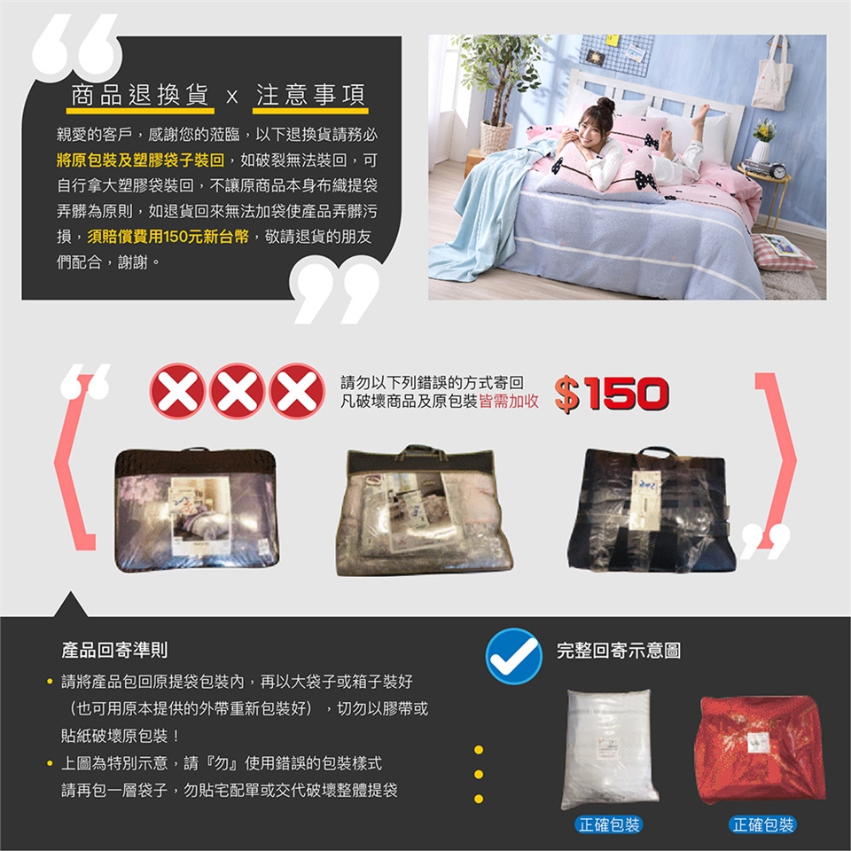 4.寢具商品屬為個人衛生用品,經使用或下水後,恕不接受退換貨