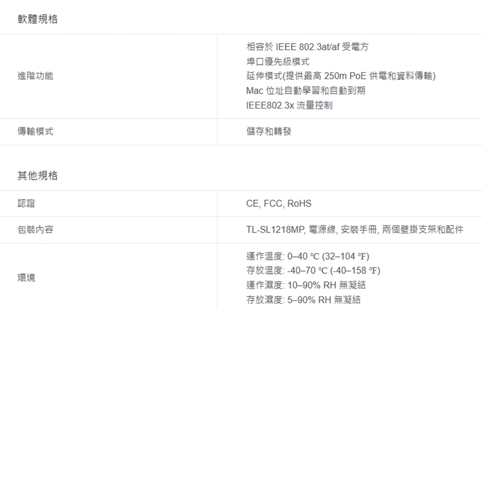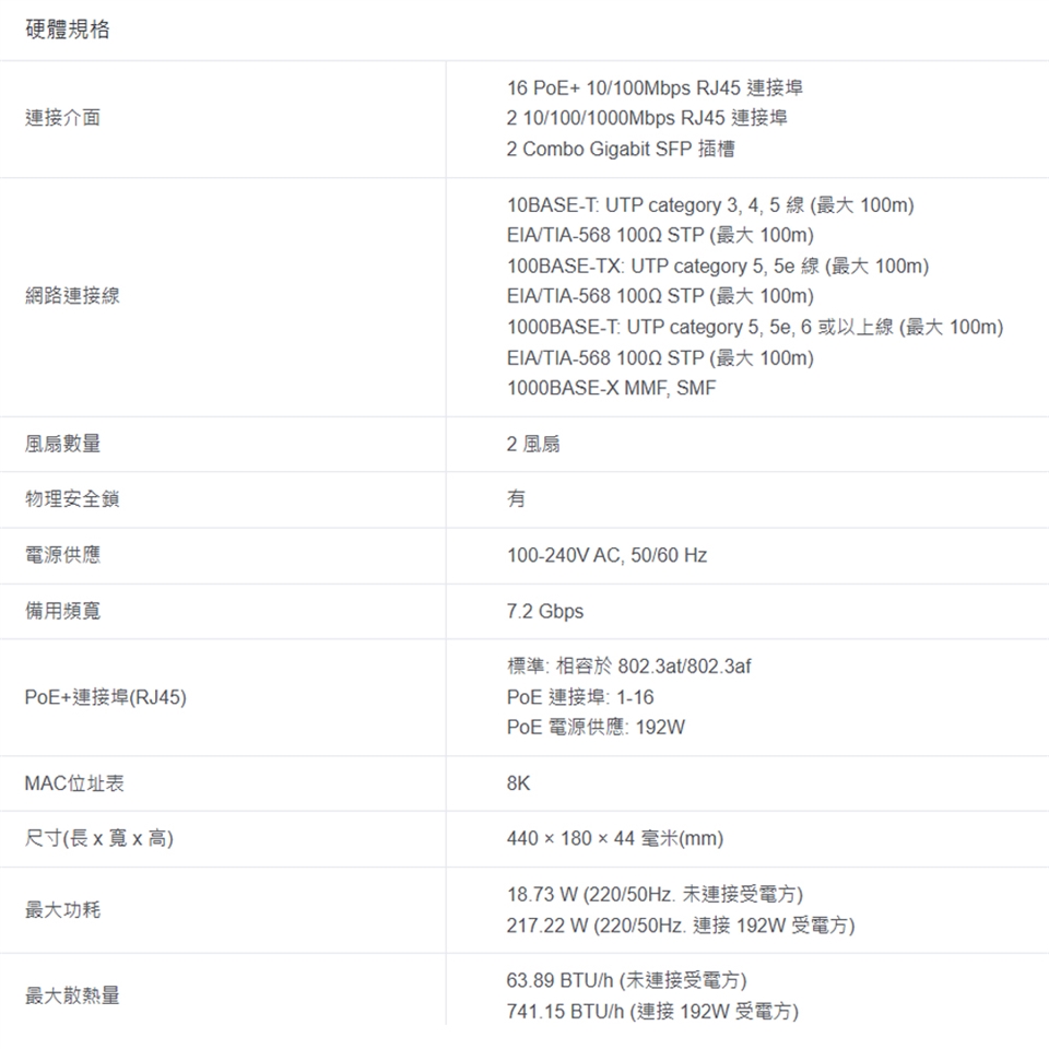 -16 PoE+ 10/100Mbps RJ45 連接埠、2 Gigabit RJ45 連接埠和 2 combo Gigabit SFP 插槽