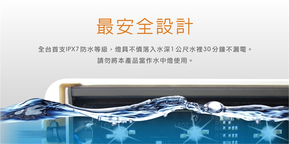 2.最安全設計:全台首支IPX7防水等級,燈具不慎落入水深1公尺水裡30分鐘不漏電。