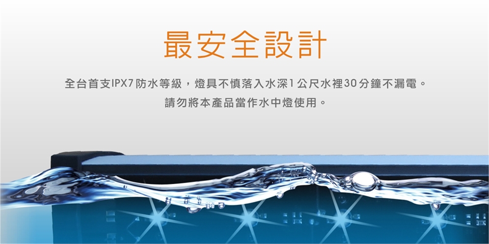 2.最安全設計:全台首支IPX7防水等級,燈具不慎落入水深1公尺水裡30分鐘不漏電。