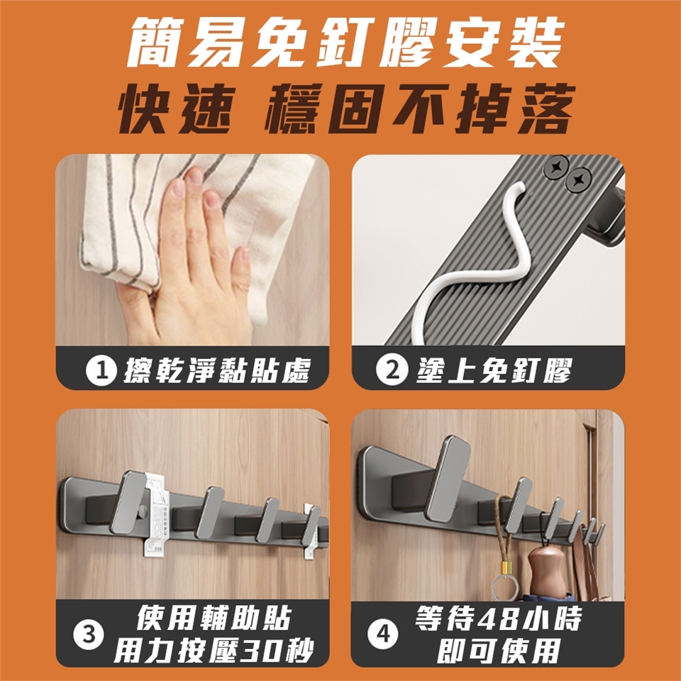 4.使用免釘膠時,為加強產品堅固度,請確實擦拭牆面,並確認牆面光滑平整,安裝後請搭配輔助貼紙固定,靜置等待72小時,待免釘膠固定後方可置物使用。