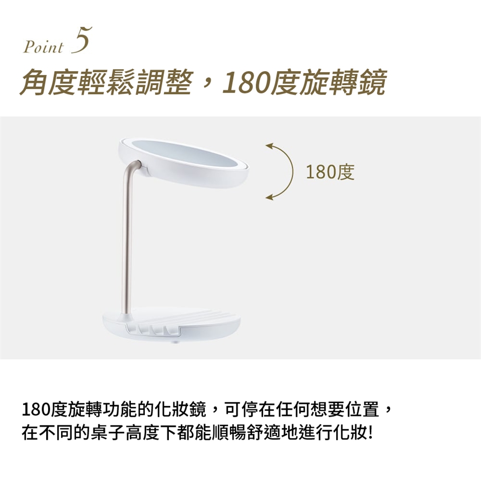 ◆角度輕鬆調整,180度旋轉功能,在不同桌子高度下都能順暢進行化妝。