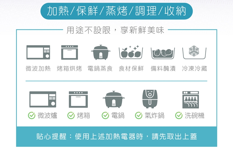 盒蓋/PP(聚丙烯耐熱120℃)+食品級矽膠圈(耐熱200℃)