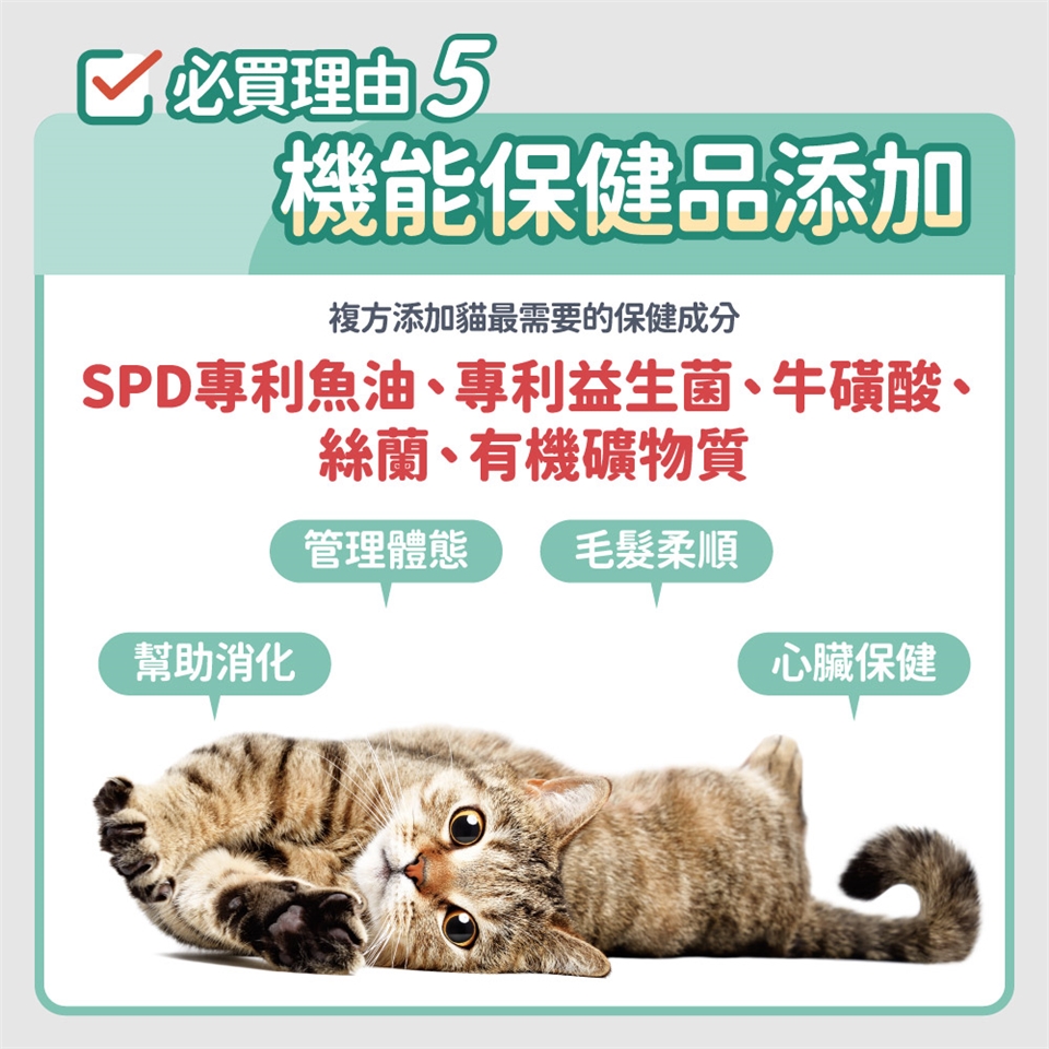 我們的動物肉來源,堅持不使用4D肉,即已死亡(Dead)、瀕死(Dying)、有疾病(Disease)、有殘缺(Disable)的動物。只使用最健康的雞肉、魚肉等肉品來源,給貓咪最優質的蛋白質。