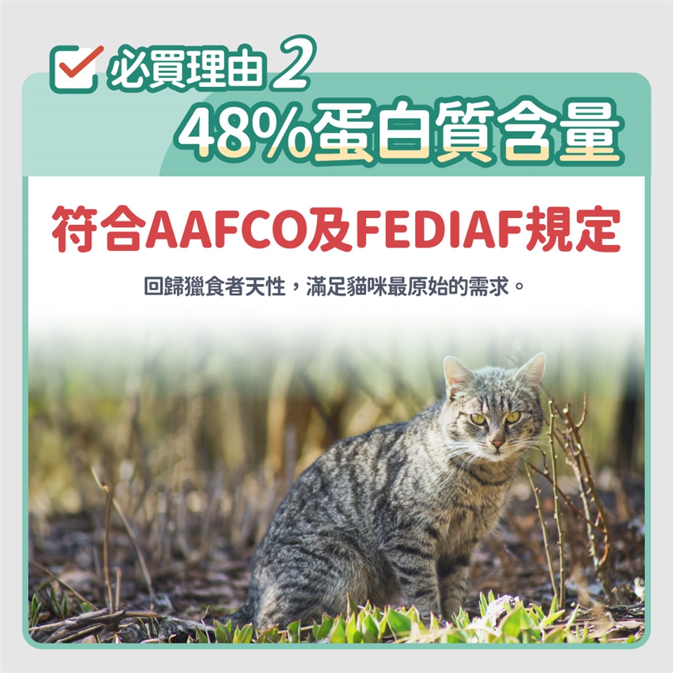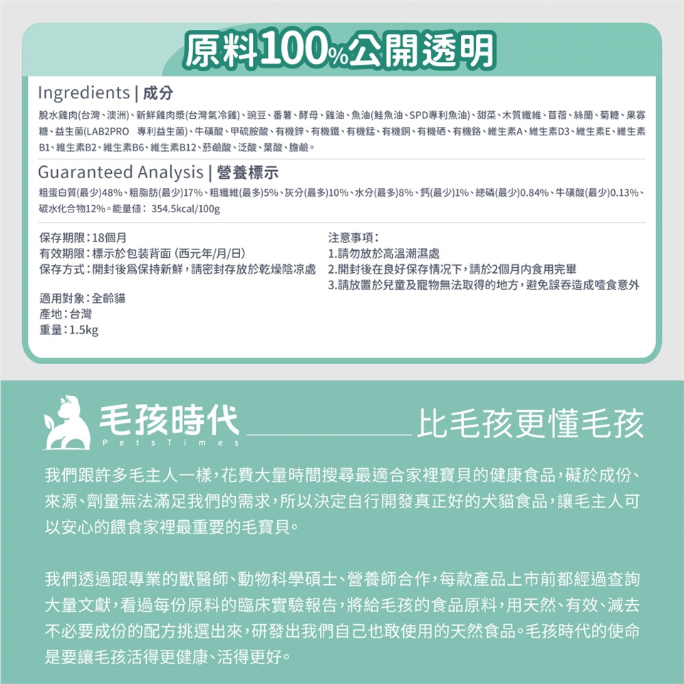 挑選貓咪飼料其實不難,除了最基本按照AAFCO及FEDIAF公布的資訊對照,及從三大營養蛋白質、脂肪、碳水化合物去看分配的比例,再往下展開找出三種營養的來源,比如蛋白質是從什麼樣的動物肉或是植物取得?碳水化合物來源是什麼?從最源頭找出飼料的成分,就能挑出最適合毛孩的主食飼料。毛孩時代的飼料除了營養成分符合AAFCO及FEDIAF兩大組織規範,同時從貓最深層的健康需求出發,使用嚴格把關的優質肉類、超過80%的動物性蛋白、專利保健成分添加、優質澱粉來源等等,全方位滿足貓咪身體所需。