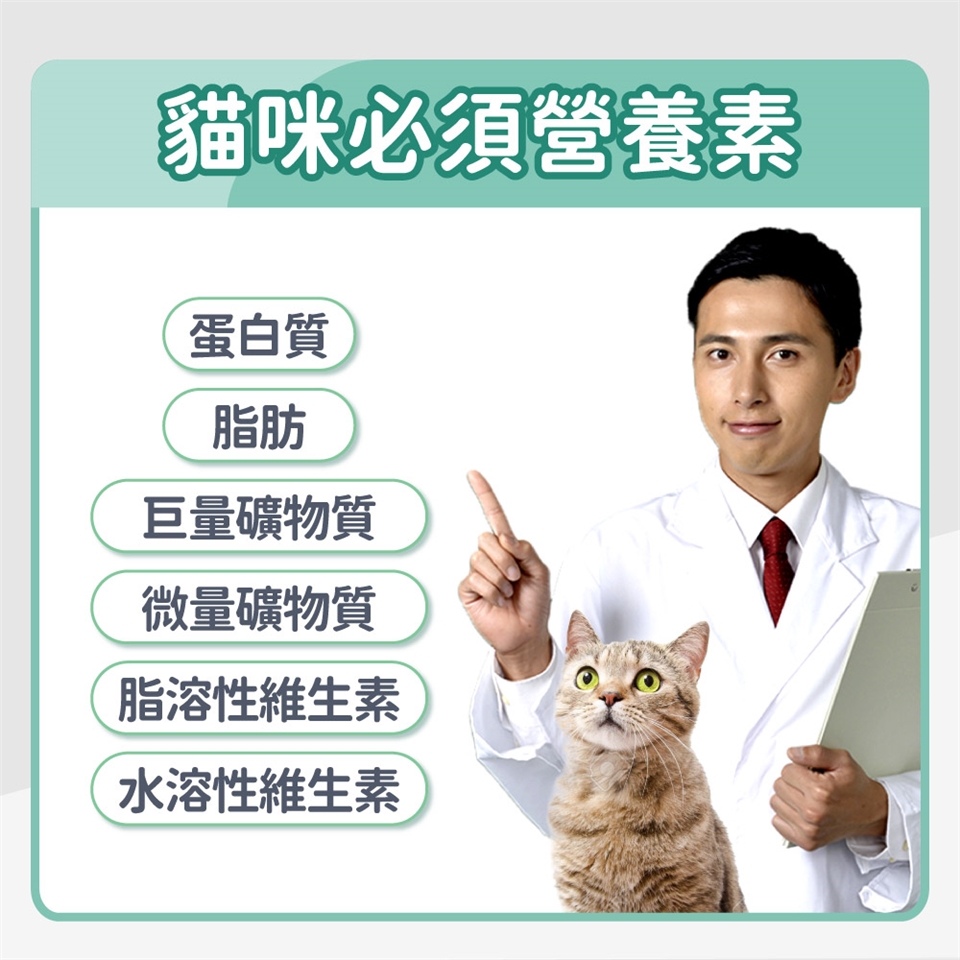 - 維生素和礦物質:貓需要維生素A、B群、C、D、E、K、鈣、鎂、磷和鈉等營養素。