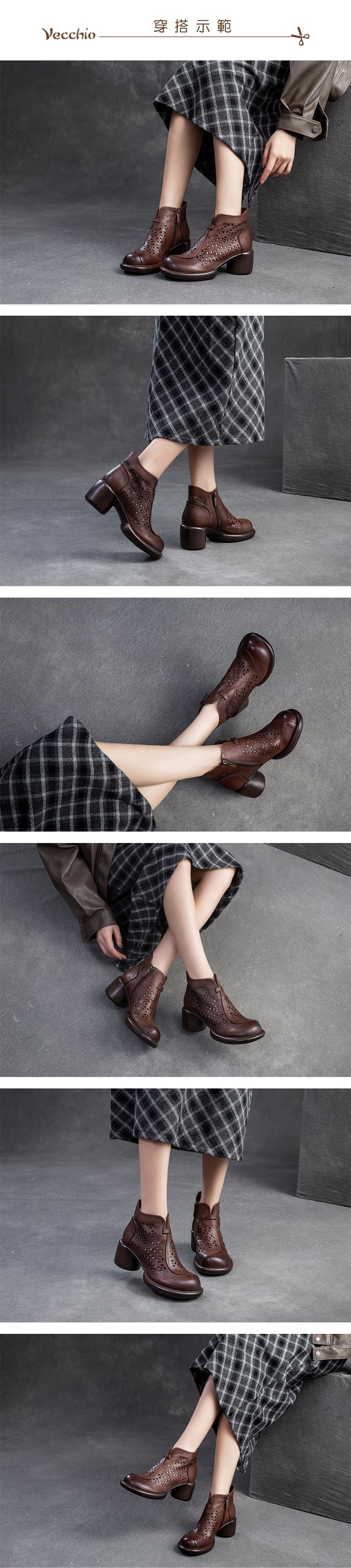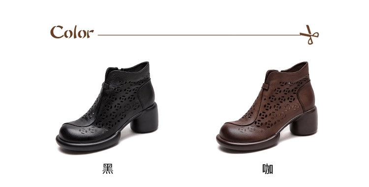【VECCHIO】全真皮縷空銅錢粗跟短靴/全真皮頭層牛皮復古縷空銅錢設計粗跟短靴 涼靴 女鞋 咖