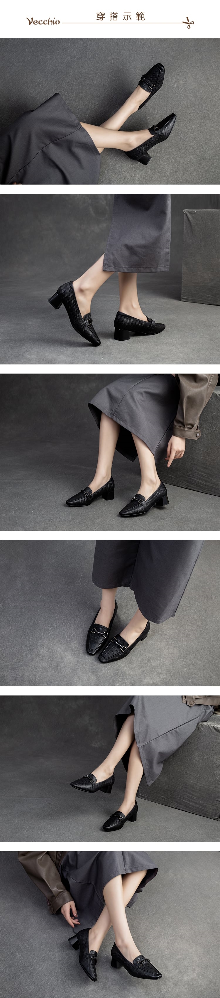 【VECCHIO】羊皮小方頭馬銜扣高跟鞋/全真皮羊皮小方頭印花馬銜扣飾高跟鞋 女鞋 黑