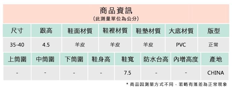 2.鞋類商品依功能及用途之不同,鞋底各有其止滑係數之個別不同,使用鞋類商品請用於正常平坦之路面,非雨鞋或雨靴類商品,請避免穿著於下雨濕滑路面上行走。