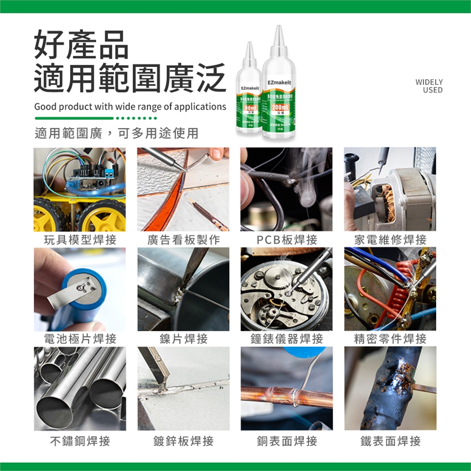 不鏽鋼、鍍鋅板、錦、銅、鐵等多種金屬焊接輔助,應用於各類不銹鋼產品、廣告字、電池極片、鐘錶儀器、精密零件、玩具模型、醫療器材及PCB板等