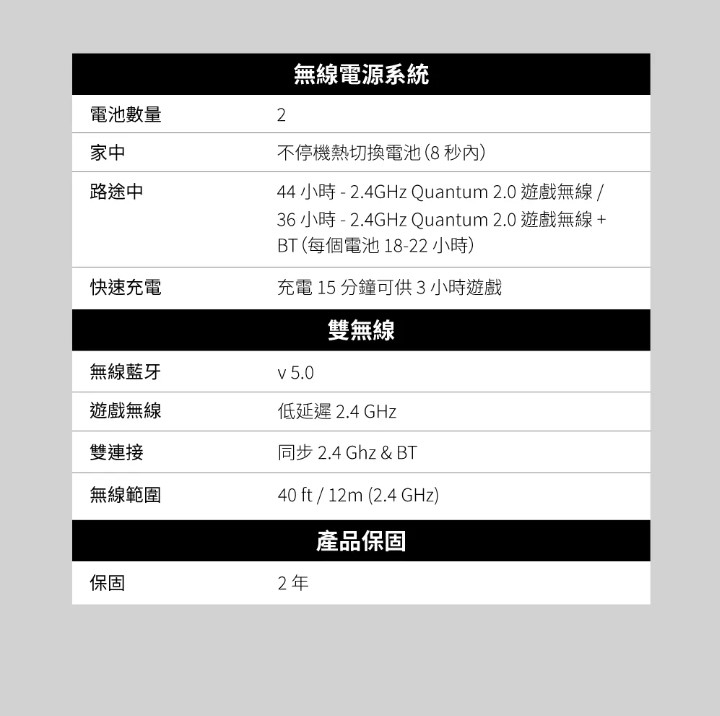 工作時間:44 小時 - 2.4GHz Quantum 2.0 遊戲無線 / 36 小時 - 2.4GHz Quantum 2.0 遊戲無線 + BT(每個電池 18-22 小時)