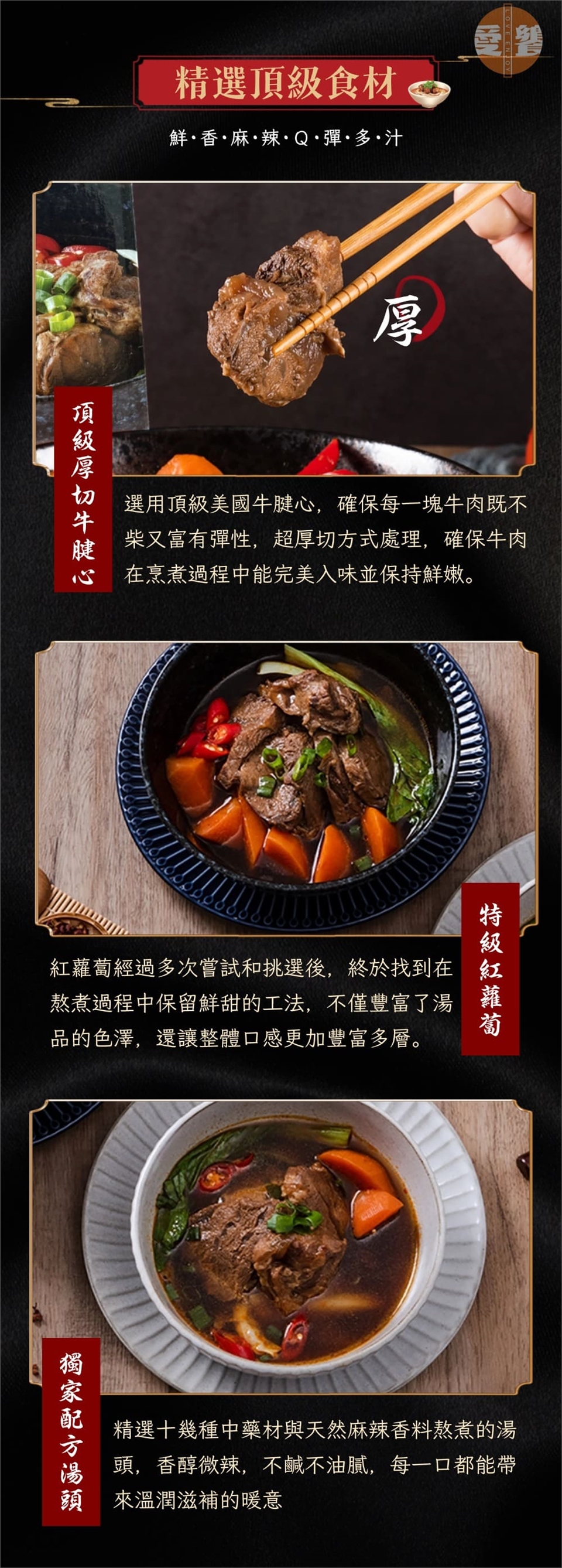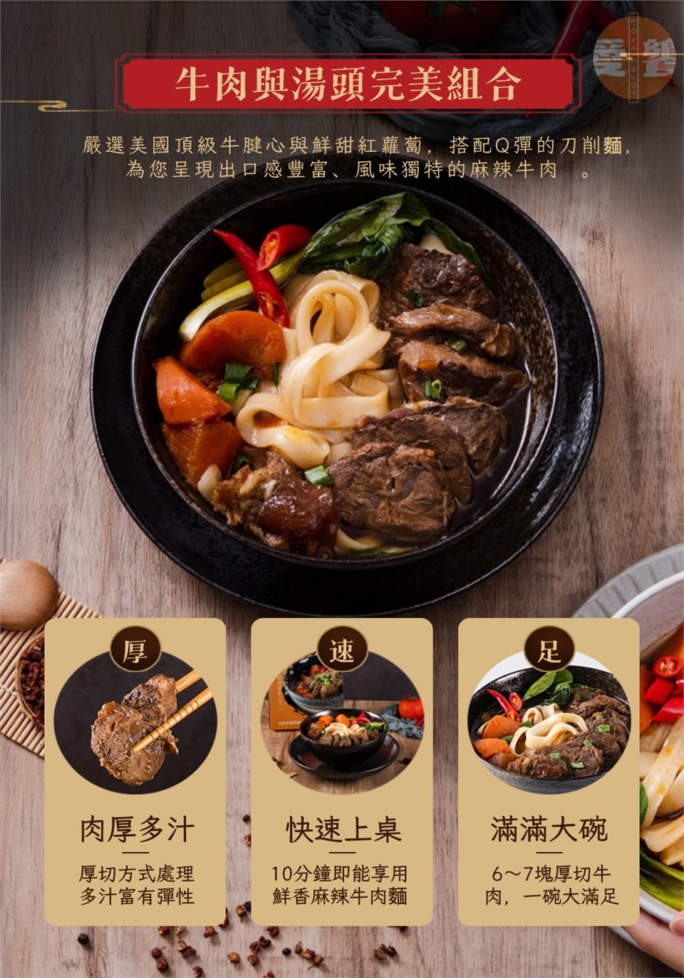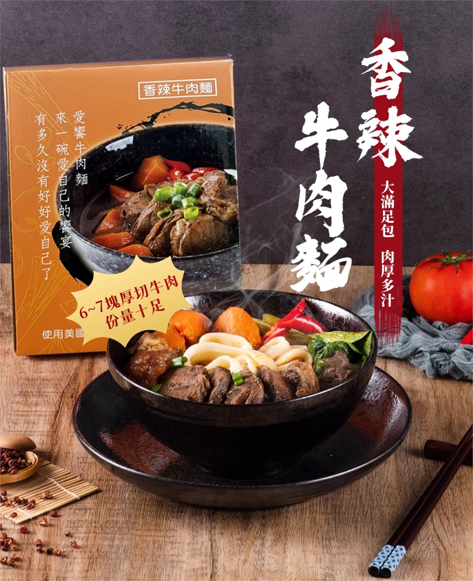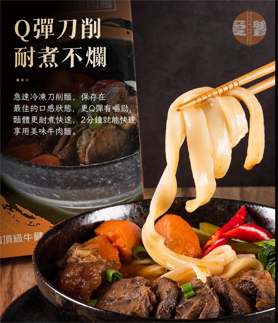 - 精選頂級食材:美國頂級牛腱心與鮮甜紅蘿蔔搭配彈牙刀削麵,創造出獨特的麻辣牛肉麵。