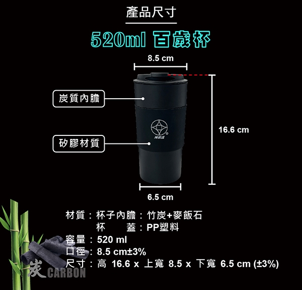 材質:杯身→竹炭、麥飯石、矽膠;杯蓋→PP塑料