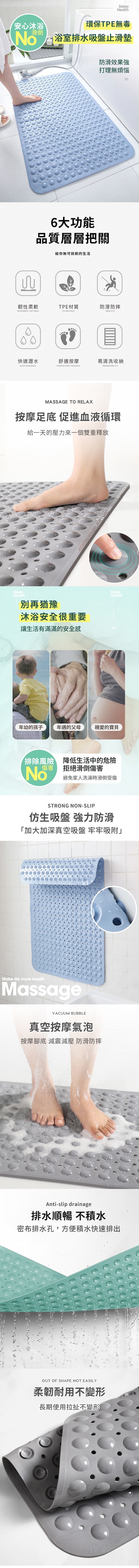 ●強力吸盤 牢吸地面不滑動 ,平滑圓球 Q彈舒適按摩腳感,大透水孔設計,快速排水,TPE環保無毒 德國認證