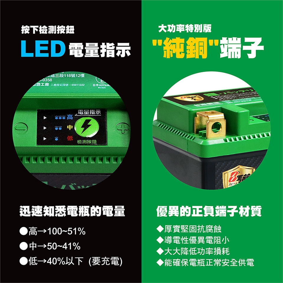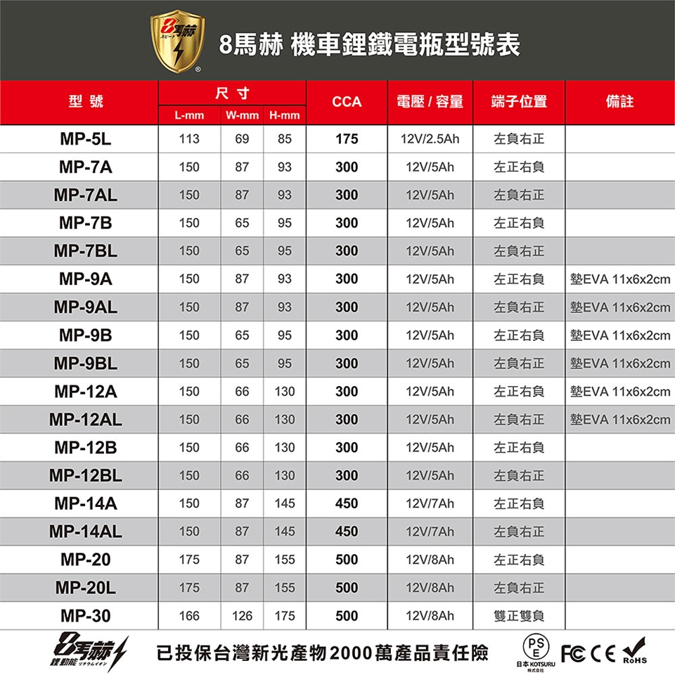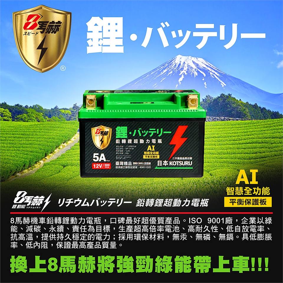 8馬赫機車鉛轉鋰動力電瓶,生產組裝臺灣,ISO 9001廠,企業以綠能、減碳、永續、責任為目標,生產超高倍率電池,採用最新研發奈米高倍率電芯、能量密度高、重量最輕、電力強勁、啟動電流最強;容量大,使用時間長,為最強悍的綠色能源。