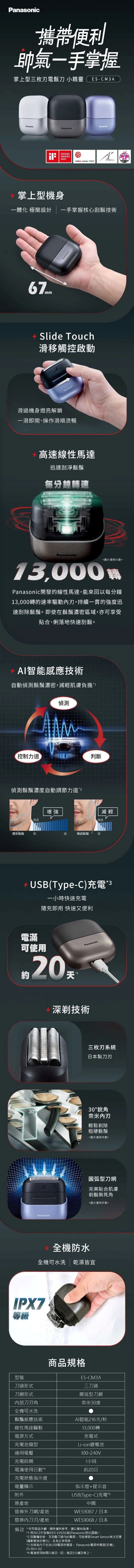 Panasonic 國際牌 掌上型三刀頭防水充電式電鬍刀ES-CM3A