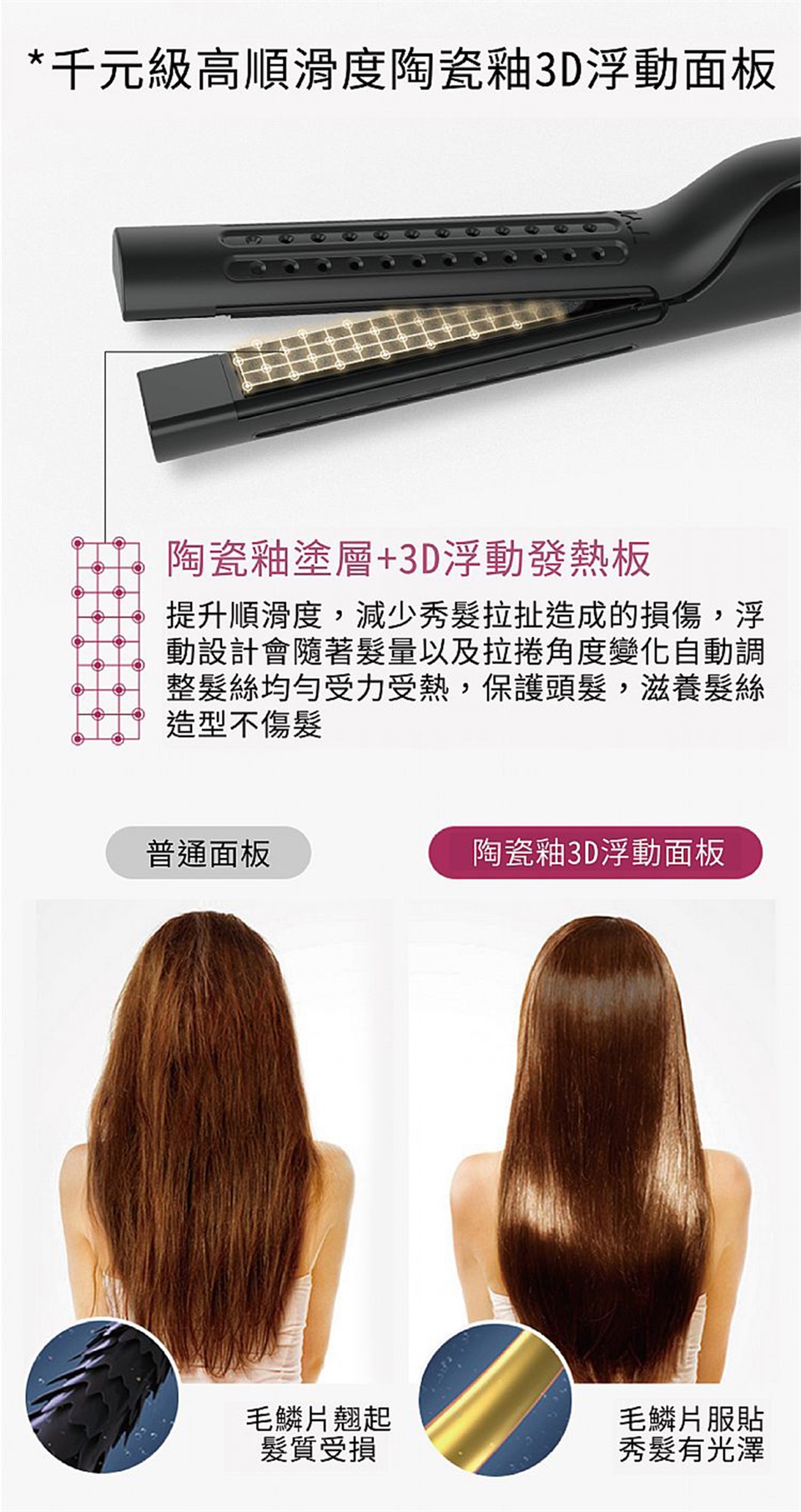 ★頂級陶瓷釉 3D 浮動發熱面板,減少秀髮拉扯損傷